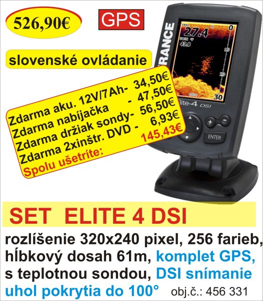 Kúpou Vianočného setu sonaru Elite 4 DSI získate ZDARMA držiak sondy, gelovú bezúdržbovú baterku 12V/7Ah, inteligentnú nabíjačku a inštruktážne DVD v slovenčine v hodnote 145,43 eúr. Sonar s farebným displejom, snímaním DSI /ako fotografia/.