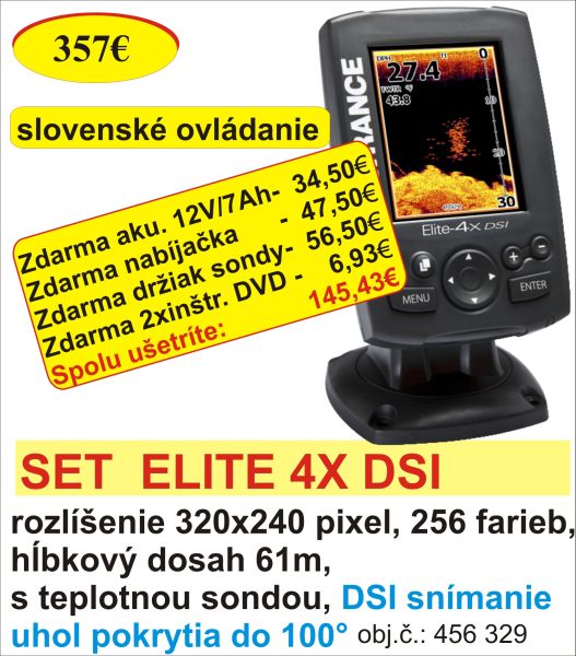 Nový neuveriteľný sonar Elite-4x DSI s vykreslením DownScan Imaging™ vás dostane do novej dimenzie vašich úspechov vo vyhľadávaní -- a rybárčení -- na vašich obľúbených miestach jasne, presne a za skvelú cenu. Nový - jasnejší displej s uhlopriečkou 3,5 palca/8,9cm poskytuje najlepšie vykreslenie za každých podmienok.