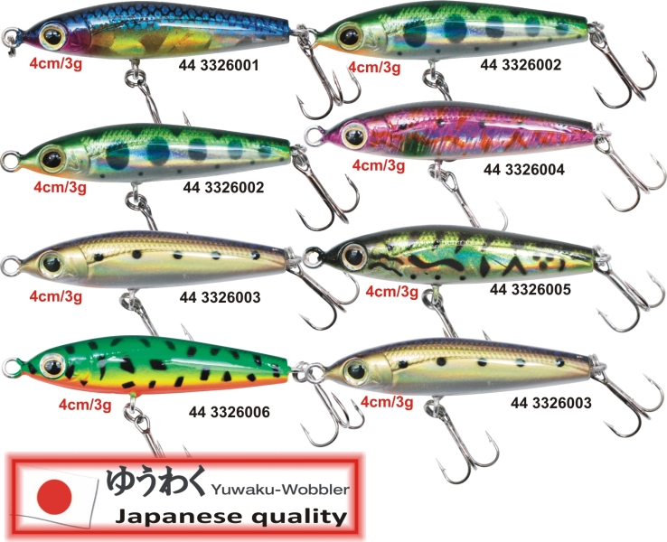 Jeden z najmenších jerkbaitov na svete-4cm dĺ. a 3g váha! Je vyrobený z plastu, je vertikálne potápavý, výborne pracuje pri poťahovaní do strán s jemným prútom a s použitím malých obratlíkov s karabínami. Vynikajúca nástraha na ostrieže, pstruhy, jalce.