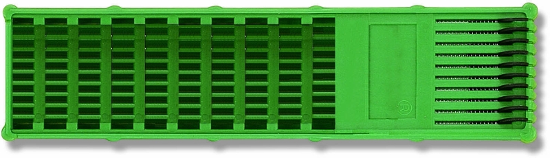 Dvojstranný plastový zásobník na 20 ks nadväzcov. Je vyrobený z plastu, má posuvné úchyty s pružinkami na uchytenie ôk nadväzcov a ich napnutie, háčiky sa upevňujú do štrbín zásobníka. Je jednoduchý a praktický.