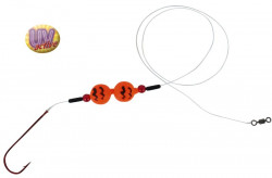Hotový morský nadväzec s dvomi farebnými guličkami, jednoháčikom s dlhým ramienkom, naviazaný na vlasci priemeru 0,40mm s dĺžkou 35cm. Má UV aktívne farby.