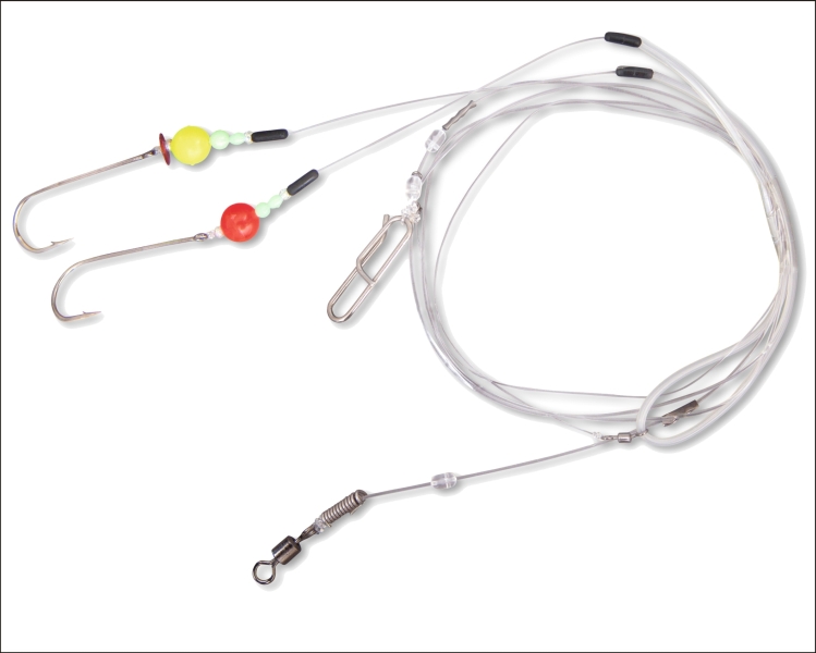 Morský koncový systém bez záťaže s dvomi jednohákmi s dlhým ramienkom veľkosti 1/0, s korálkami, ideálny pre surfový spôsob lovu z brehu na živé nástrahy. Hlavný vlasec 0,7mm, nadväzce 0,45mm. S klipom.