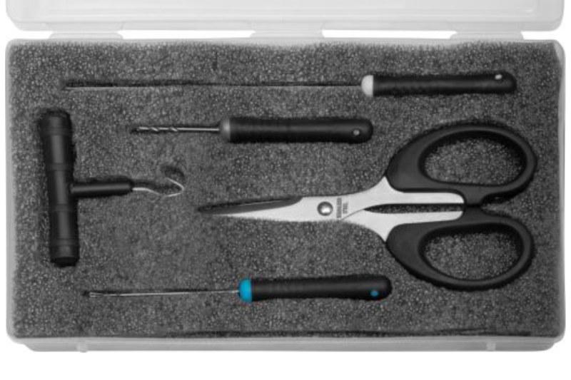 V tejto sade nájdete nožnice, vrták, ihla, dlhá ihla, a uťahovač uzlov. Všetko uložené prehľadnom púzdre.
