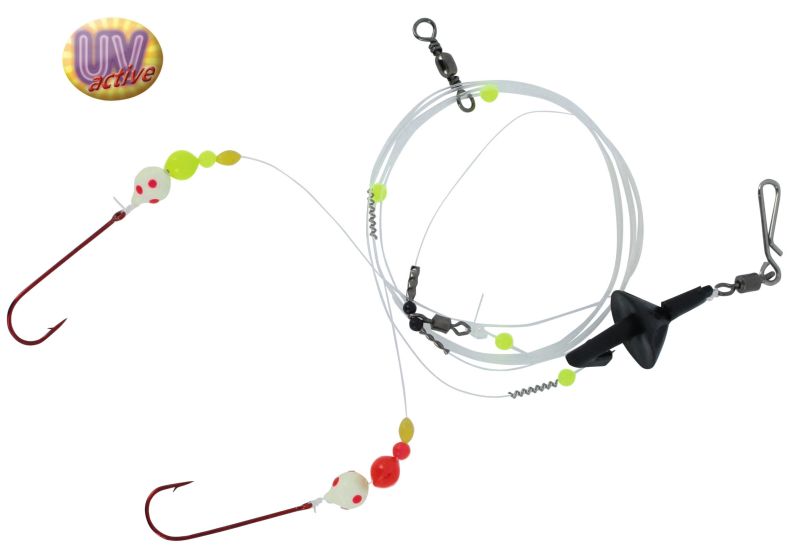 Morský koncový systém bez záťaže s dvomi jednohákmi s dlhým ramienkom veľkosti 1/0, s korálkami, ideálny pre lov z brehu aj člna na živé nástrahy. Hlavný vlasec 0,7mm, nadväzce 0,4mm. S klipom. UV aktívne farby.